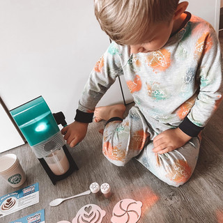 The boys have absolutely loved playing with this today especially why they are I'll it's made the perfect indoor activity making coffee-free lattes for Everyone It’s so much fun pretending to work in a coffee shop, I love trying out all the different flavours and designs with the recipe cards.